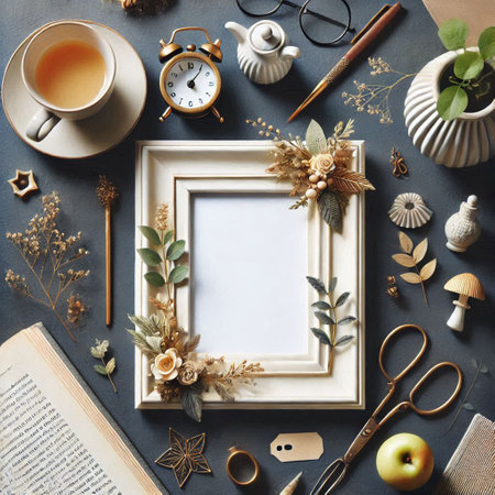 Flat lay composition with vintage frame, coffee cup, books and decorations on grey background.