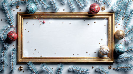 A crisp winter frame with pine sprigs and glitter ornaments neatly bordering an empty white middle section.