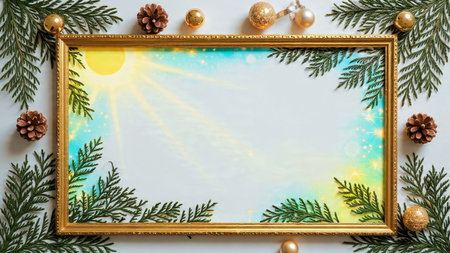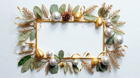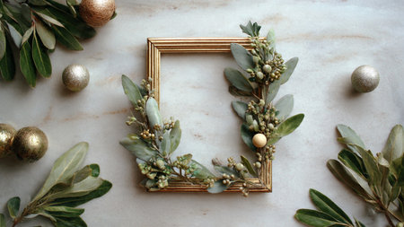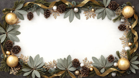 Luxurious Christmas greenery paired with metallic ornaments forming a stunning frame.