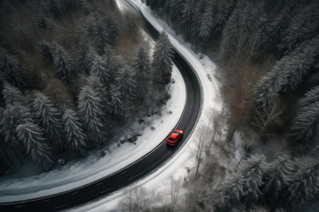 Red car on snowy mountain road, aerial view.