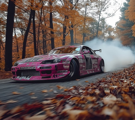 A powerful racing car performs a thrilling drift, creating dramatic smoke clouds on the asphalt. The image captures the essence of speed and adrenaline in motorsport.