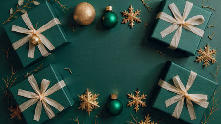 Stylish winter composition featuring emerald gift boxes wrapped in soft shimmering gold ribbons.