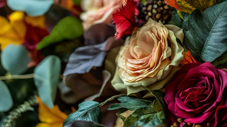 This beautiful floral arrangement features an assortment of fresh roses and eucalyptus leaves on a dark background, ideal for design inspiration and artistic projects.