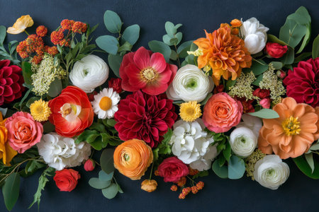 A colorful variety of flowers creates a stunning arrangement featuring reds, oranges, and whites against a dark backdrop. Each bloom adds unique texture and charm to the overall display.