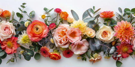 Top view of a bouquet of fresh flowers on a white background with space for text