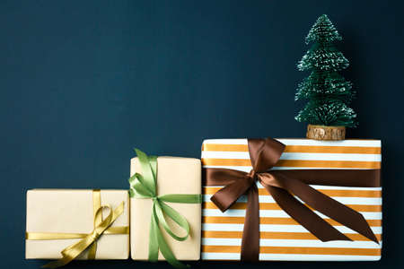 Christmas and New Year background with gifts, deer, stars and firtrees, flat lay on a dark blue background, holiday greetings, concept of a winter background with free space