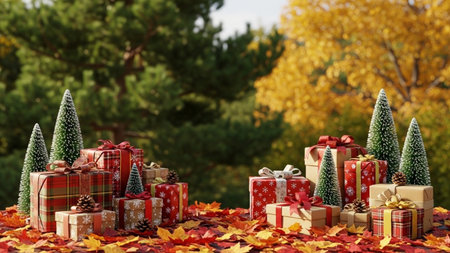 Christmas tree, gifts and autumn leaves in the park. 3d rendering