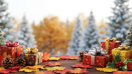 Gift boxes and autumn leaves on wooden table in front of Christmas tree