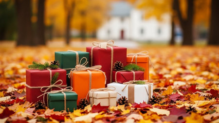 Gift boxes on autumn leaves background. Holidays and celebration concept