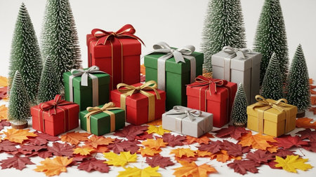 Christmas gift boxes with autumn leaves and pine trees on white background.