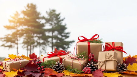 Christmas presents with fir branches and red ribbons on autumn leaves background
