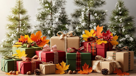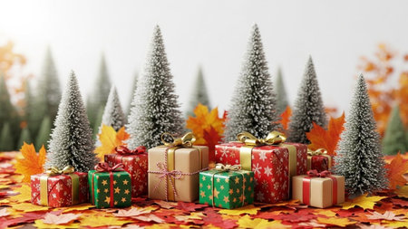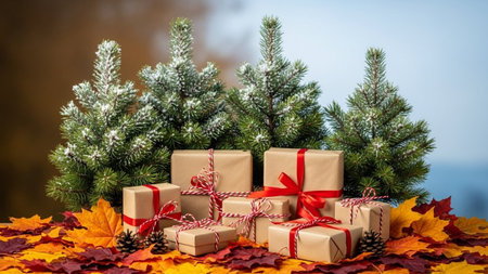 Gift boxes and Christmas trees on the background of autumn leaves.