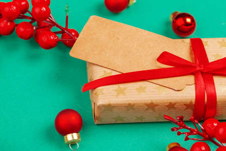 Christmas and New Year gift box wrapped in festive paper and ribbon by fir garland. Present for winter holidays on red background