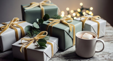 A cozy arrangement of beautifully wrapped gifts with gold ribbons, accompanied by a cup of hot chocolate topped with marshmallows, set against a softly lit background with bokeh lights