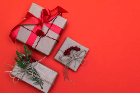 Christmas gifts on a red background. Boxes in simple packaging with natural decor. Horizontal photo.
