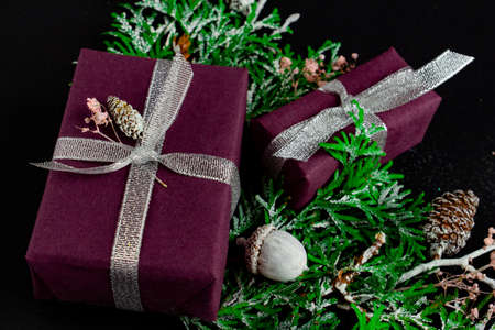 family gifts. selection of various presents on dark background. packages wrapped in red purple and craft paper with ribbon bows. christmas traditions and new year celebration concept.