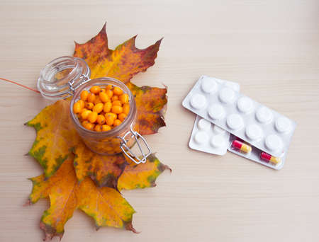 sea-buckthorn berries and autumn leaves, alternative medicine, treatment in the fall