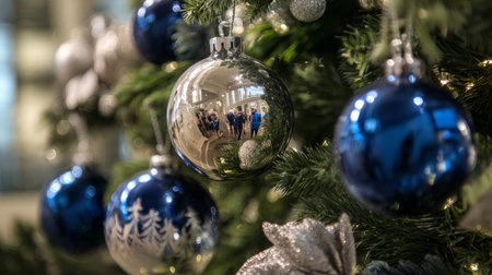 Beautiful pine tree branches adorned with shimmering blue ornaments. This scene captures the essence of new year festivities and winter charm.