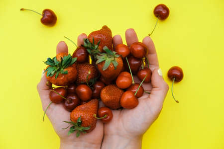 Female hands with strawberries and cherries on a yellow background. Top view, flat lay, copy space