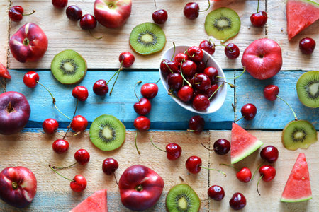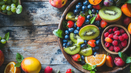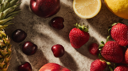Top view of assorted fresh fruits and berries. Perfect for healthy eating, fresh produce, and summer themes.
