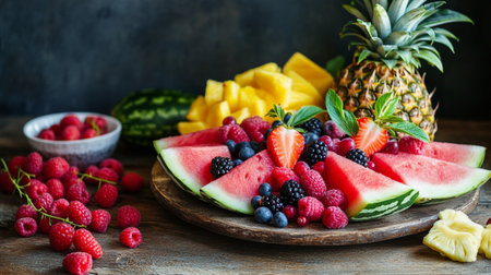 Watermelon, raspberry, blueberry and pineapple on a wooden background
