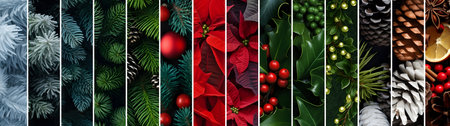 Abstract background made of seasonal and winter stripes with plant, leaf, ball, cone and spice texture in green, red, white and brown colors. Horizontal composition. Concept of Christmas, holiday and New Year.