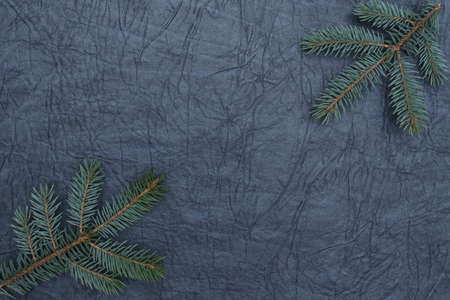 Merry christmas and a happy new year! A sprig of the green symbol of the winter holidays - spruce with decorations on a background of gray artificial leather backing.