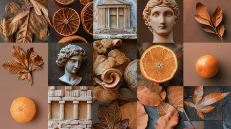 A collage of images featuring dried orange slices, fall leaves, and ancient Greek architecture in a warm autumnal color scheme.