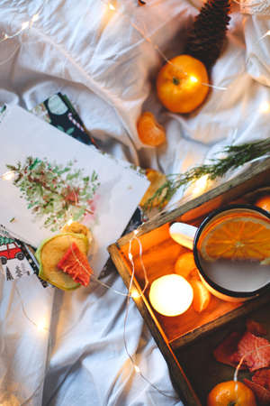 Christmas background dry oranges, sweet tangerines in a box, coffee in a white mug.