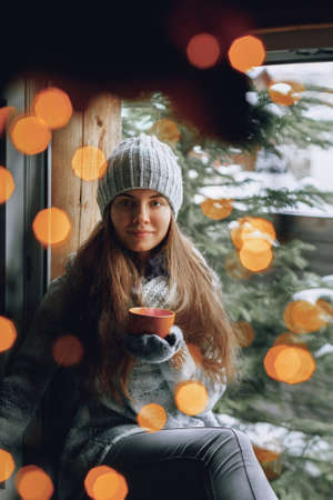 Beautiful woman holding and drinking a cup of coffee or cocoa in gloves sitting home by the window. Blurred winter snow tree background. Morning, coziness, winter and people concept