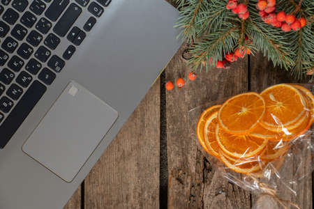 laptop branch of a Christmas tree viburnum dried orange on a wooden table, Christmas decor