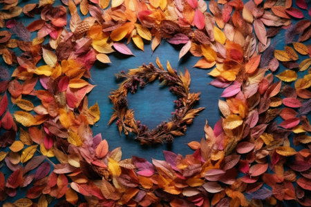 flat lay of colorful autumn leaves and wreath base, created with generative ai