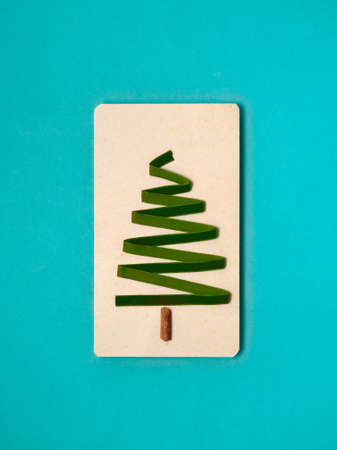 Christmas tree made of twigs on a green background with space for text. Postcard template.
