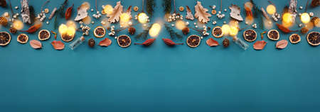 Top view Banner of holiday toys and decorations on blue Christmas background. New Year time concept.