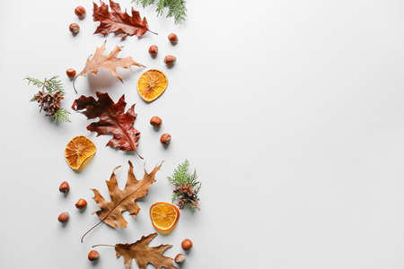 Frame of various items and food related to Christmas on light background. Flat lay. Top view. Copy space