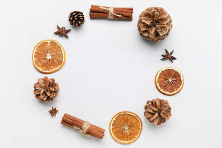 Slices of dried orange, lemon, cinnamon, cloves, cardamom and pine cone. Christmas and New Year decoration. Free space for text