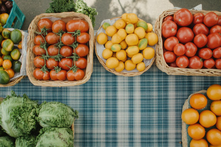 Colorful baskets filled with fresh tomatoes, lemons, and greens are arranged on a checkered tablecloth at a bustling farmers market.