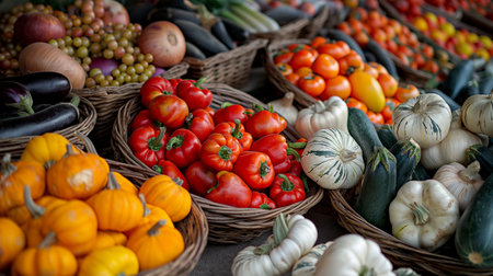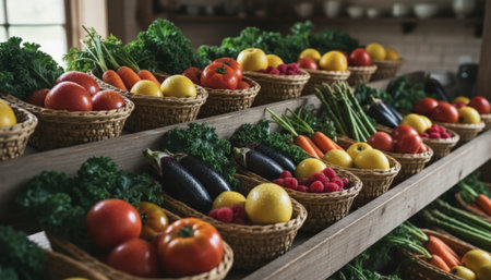 Various fresh fruits and vegetables showcasing a healthy and organic harvest, neatly arranged in wicker baskets on wooden shelves at a vibrant market stall or grocery store