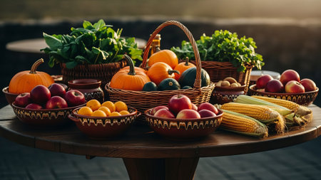 A wooden table adorned with a colorful array of fruits and vegetables, showcasing local food ingredients for wholesome recipes and natural whole foods AIG50