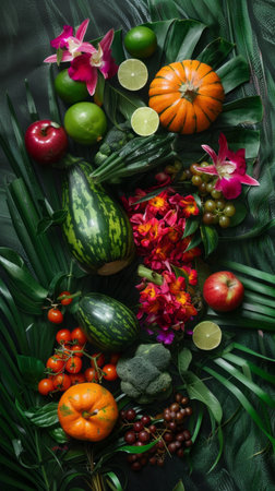 inspiring photo of fresh fruits, vegetables and herbs arranged in unique way, created with generative ai