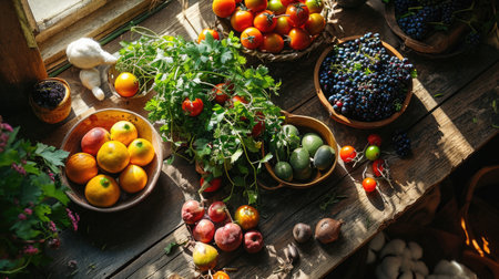 fresh vineyard produce, overhead shot, wooden harvest table, vibrant fruits and rustic wood