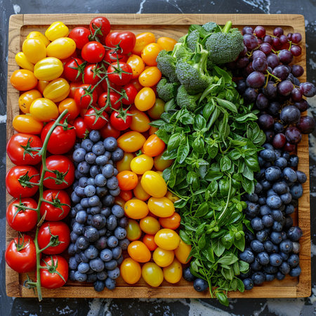 A colorful display of fresh vegetables and fruits on a rustic wooden board