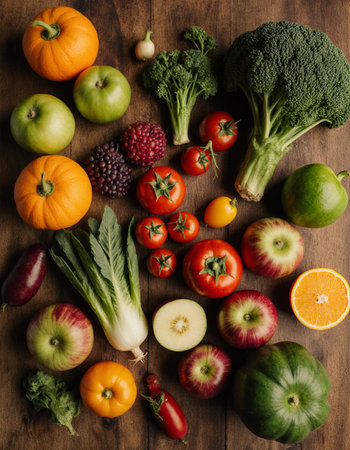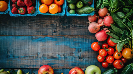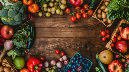 A vibrant array of fresh fruits and vegetables displayed on a wooden table, showcasing an inviting market scene. Perfect for food and lifestyle themes.