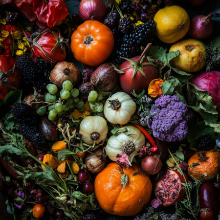 Vibrant autumn harvest with colorful fruits and vegetables displayed.