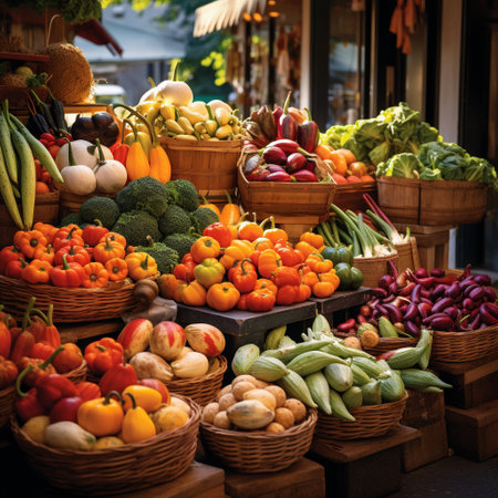 Vibrant farmers' market: Fresh produce, colorful displays, reusable bags, promoting sustainability and wholesome living