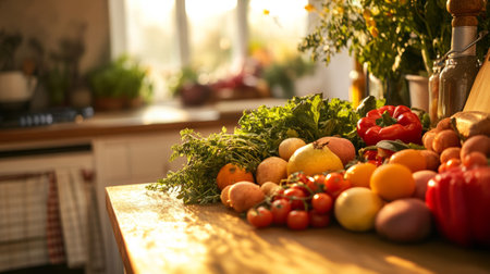 farmhouse style kitchen counter full of freshly harvested fruits and vegetables generative ai