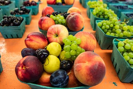 Close up of rows of neatly arranged green cardboard boxes filled with mixed fruits. Peaches, cherries, grapes and plums. Selective focus.