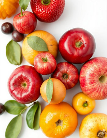 A vibrant collection of fresh fruits and vegetables displayed on a light surface, with generous copy space surrounding the items