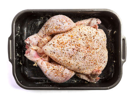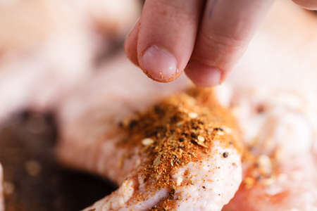 raw chicken with spices on parchment reading for cooking, horizontal image