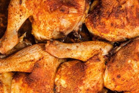 Fried golden chicken wings and legs on baking tray. Oven baked chicken pieces. Restaurant menu, dieting, cookbook recipe.
